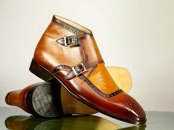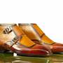 Handmade Tan Leather Buckle Boot, Men's Double Monk Strap Pointed Brogue Toe Boots