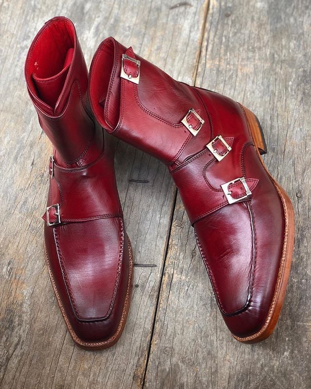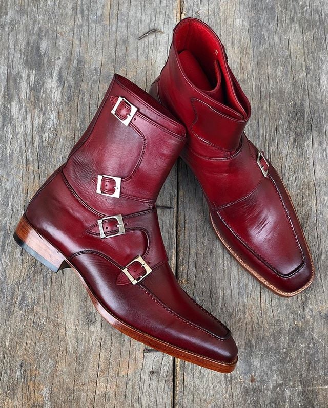 Handmade Men’s Burgundy Colour Quad Monk Strap Round Toe Ankle High Dress Boots