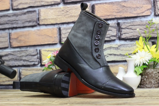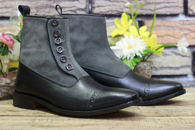 New Handmade Men's Black Leather & Grey Suede Ankle High Button Boots