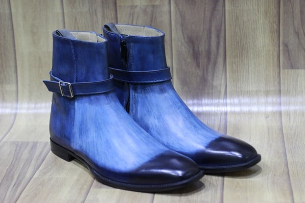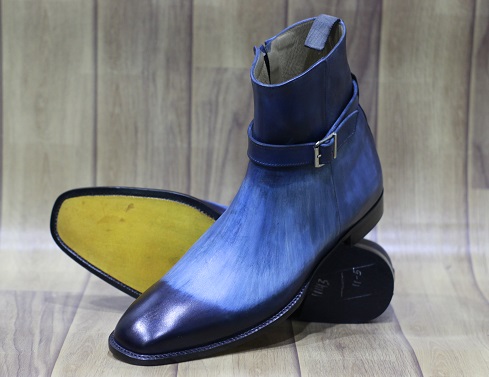 New Handmade Men's Formal Shoes Blue Two Tone Leather jodhpurs Men High Ankle Full Strip Dress Boots