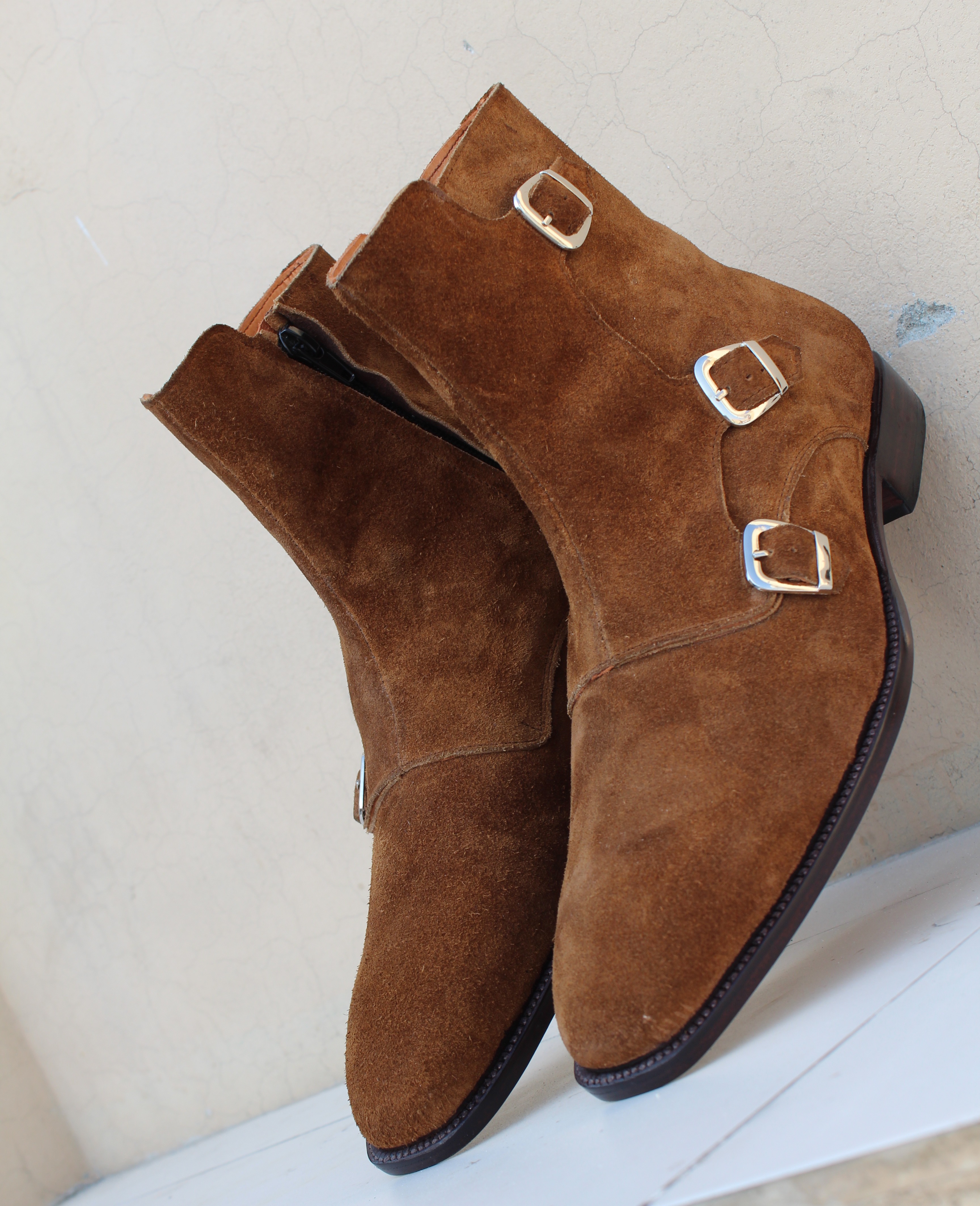 Brown Triple Monk Boots, Men Suede Leather Dress Boots, Handmade Boot