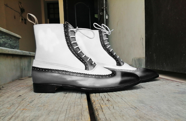 New Men's Handmade Black Gray White Ankle High Leather Lace Up Wing Tip Brogue Boot