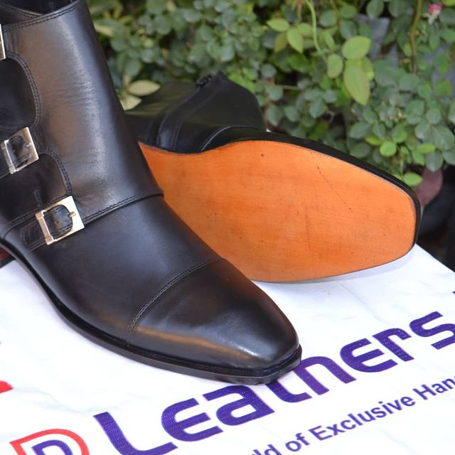 Triple Monk Strap Ankle High Black Leather Handmade Boot