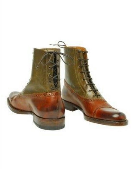Handmade Men's Premium Brown & Green Patina Leather Boots Handcrafted Burnished Ankle High Dual Lace Up Leather Boots