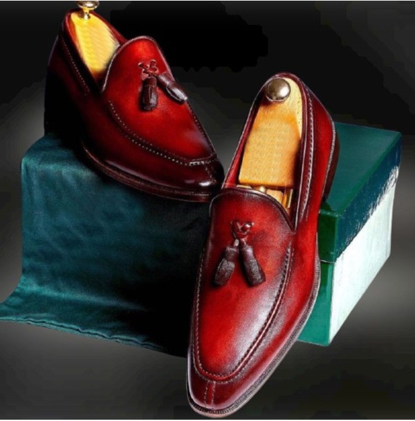 Handmade Men's Premium Red Patina Leather Tassel Loafers