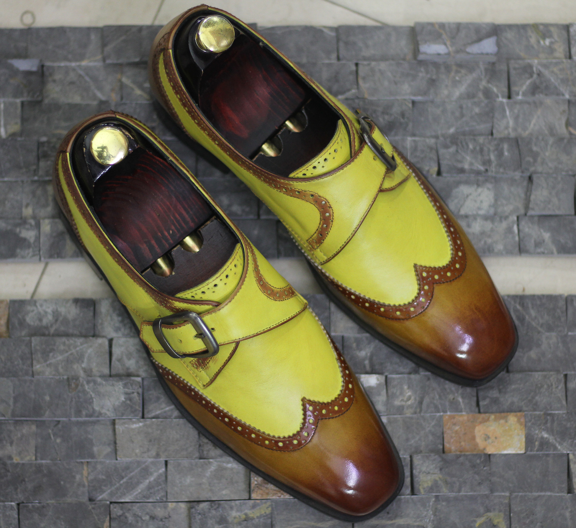Handmade Men's Monk Shoes,Men's Two Tone Leather Wing Tip Monk Strap Casual Shoes