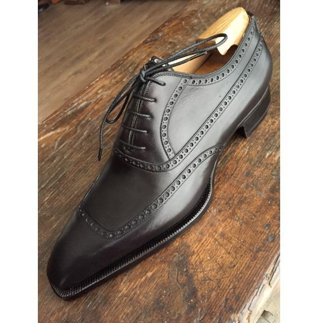 Handmade Black Leather Middle Round Toe Semi Wing Lace Up Men's Shoes