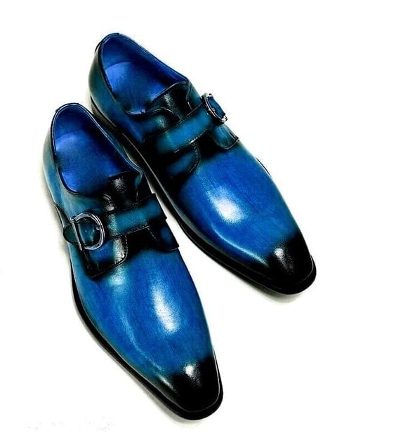 Handmade Men's Superior Blue Patina Leather Monk Buckle Derby Shoes Handcrafted
