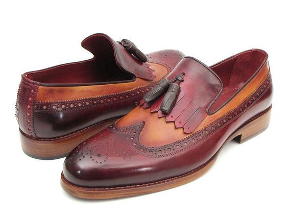 Handmade Men's Genuine Burgundy & Tan Patina Leather Tassel Loafers