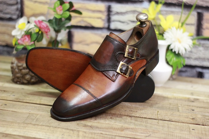 New Men's Handmade Formal Shoes Two Tone Brown Leather Double Buckle Monk dress & Casual Wear Shoes