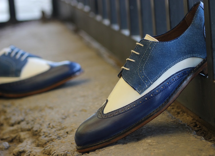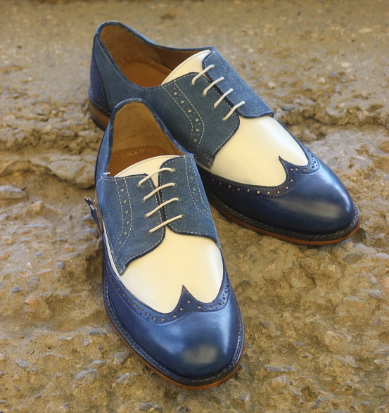 Men's Handmade Shoes White & Blue Leather Lace Up Stylish Wing Tip Dress & Formal Wear Shoes