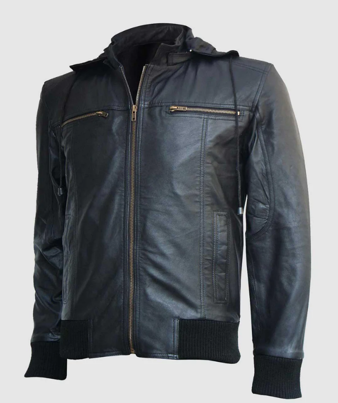 Hooded Jacket Color: Black Two Side Leather One Inside Pocket for Mobile Lining : Polyester Zipper: closure Front Zip Fasten Occasion: Casual, Party/Cocktail, Travel Totally Hand stitched Manufacturing time 7-10 business days If you can’t find your Size/Color just send us message we will make for you. Please write us an email for any kind of customization