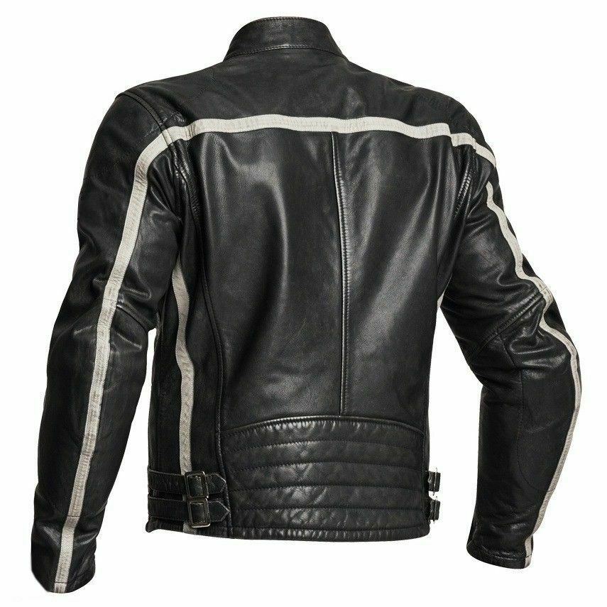 Men's Handmade Black Leather White Strip Zipper Biker Leather Jacket