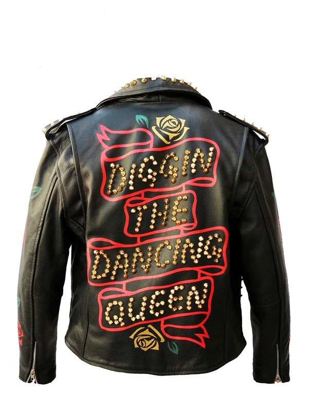 New Men Women's Custom Made Black Leather Full Metallic Studded Diggin The Dancing Queen Printed Zipper Belted Stylish Leather Jackets