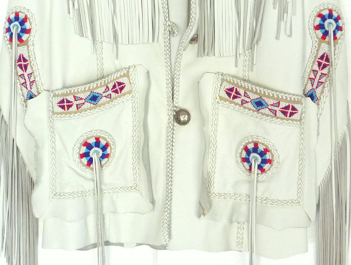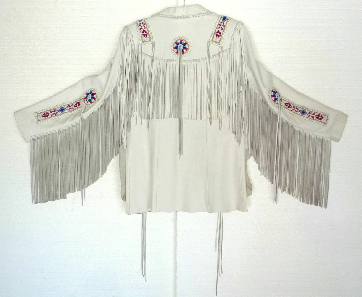 Men White Suede Leather Vintage Jacket Cow-boy Fringed and Beaded Coat