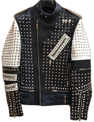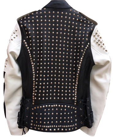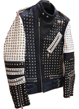 New Men's Handmade Pure Leather Black & White Leather Silver Studded Fashion Biker Jackets