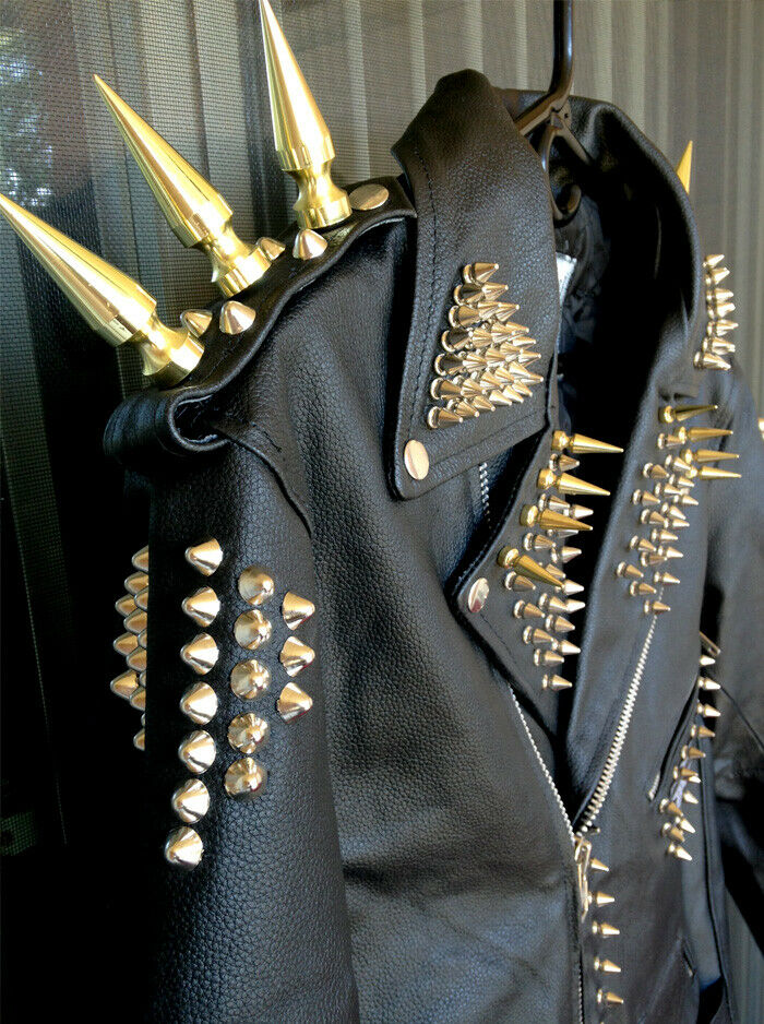 Handmade Men's Customized Golden Spiked Studded Leather Jacket
