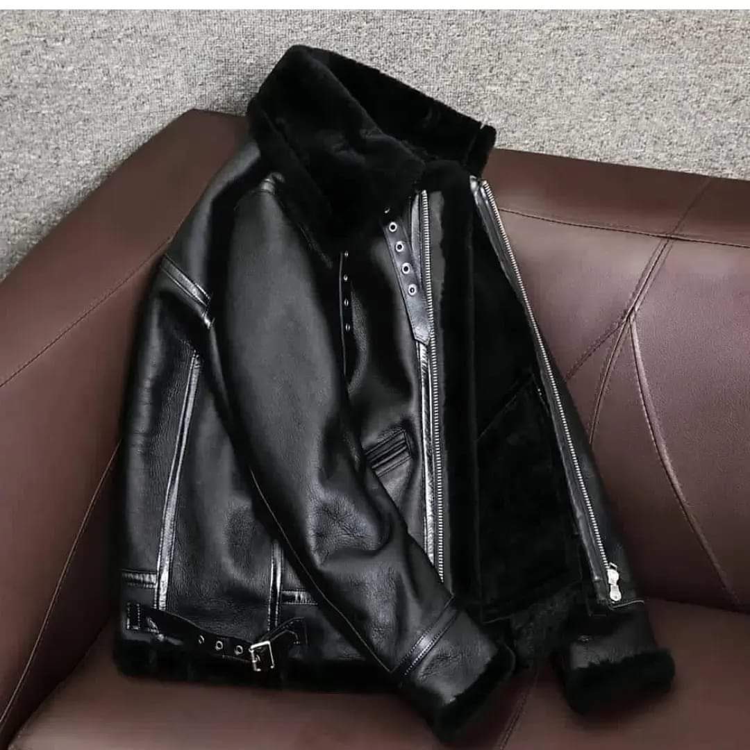 MEN BLACK PUNK FUR JACKET, MEN BLACK SHEEP LEATHER BOMBER JACKET