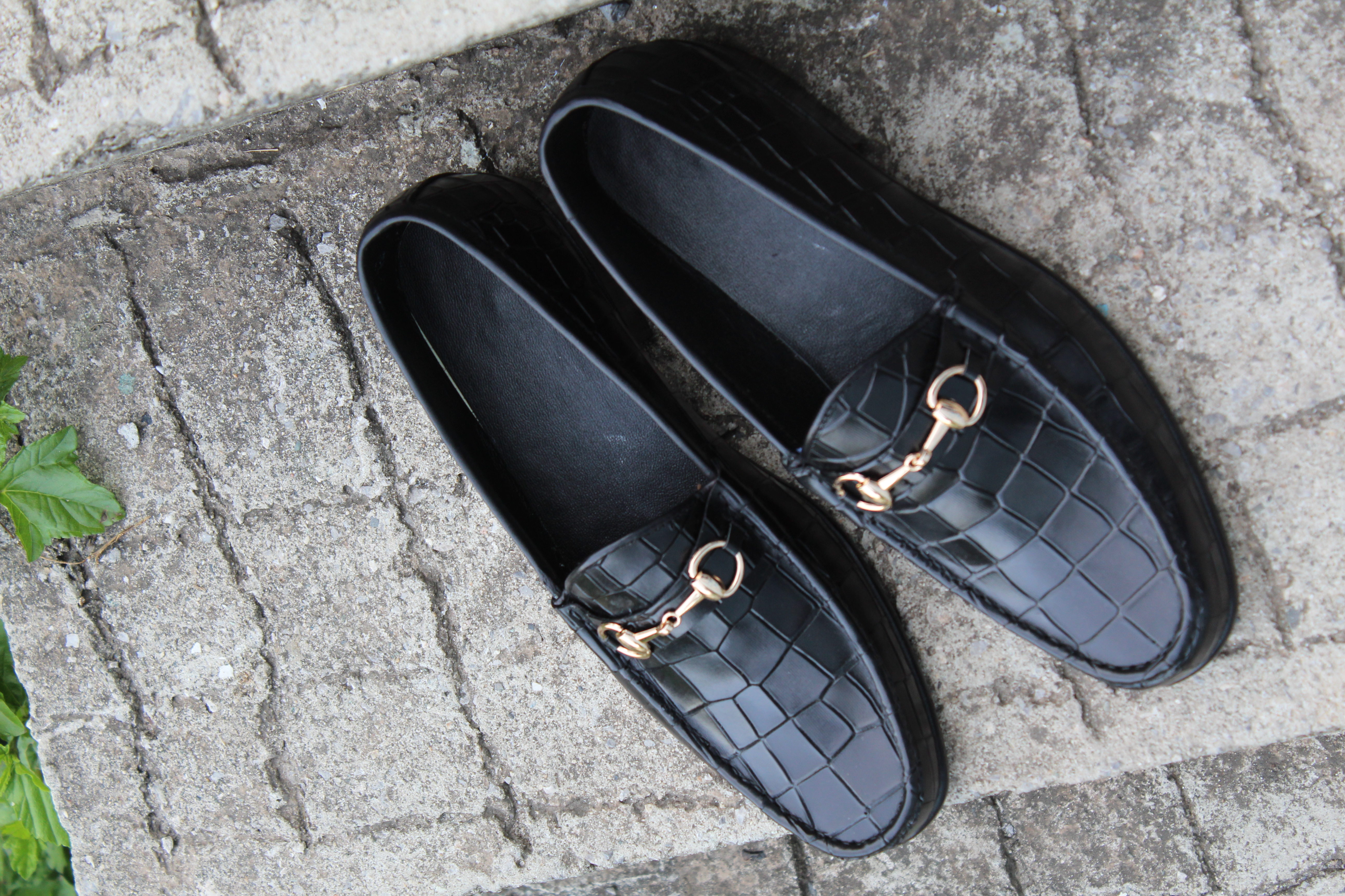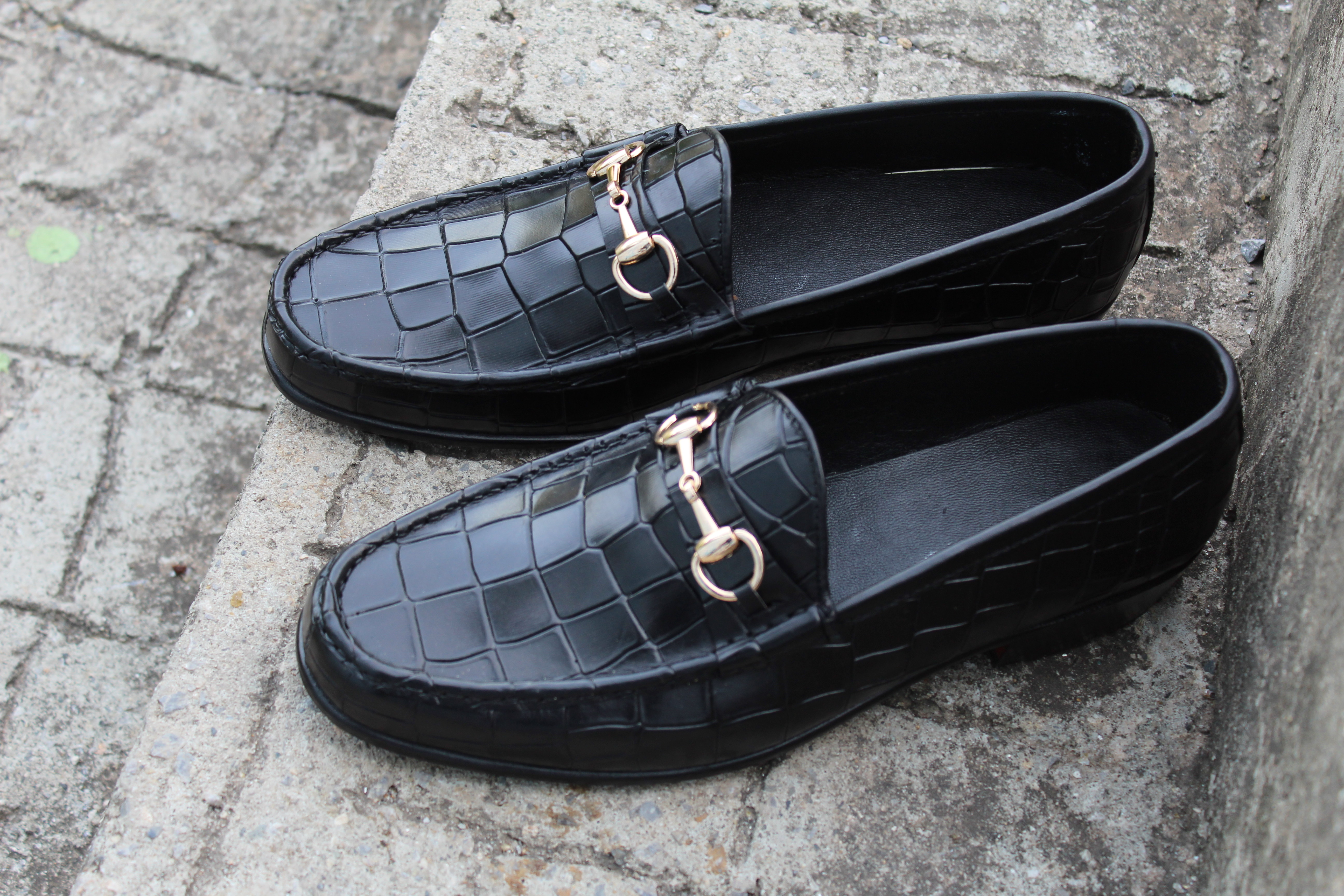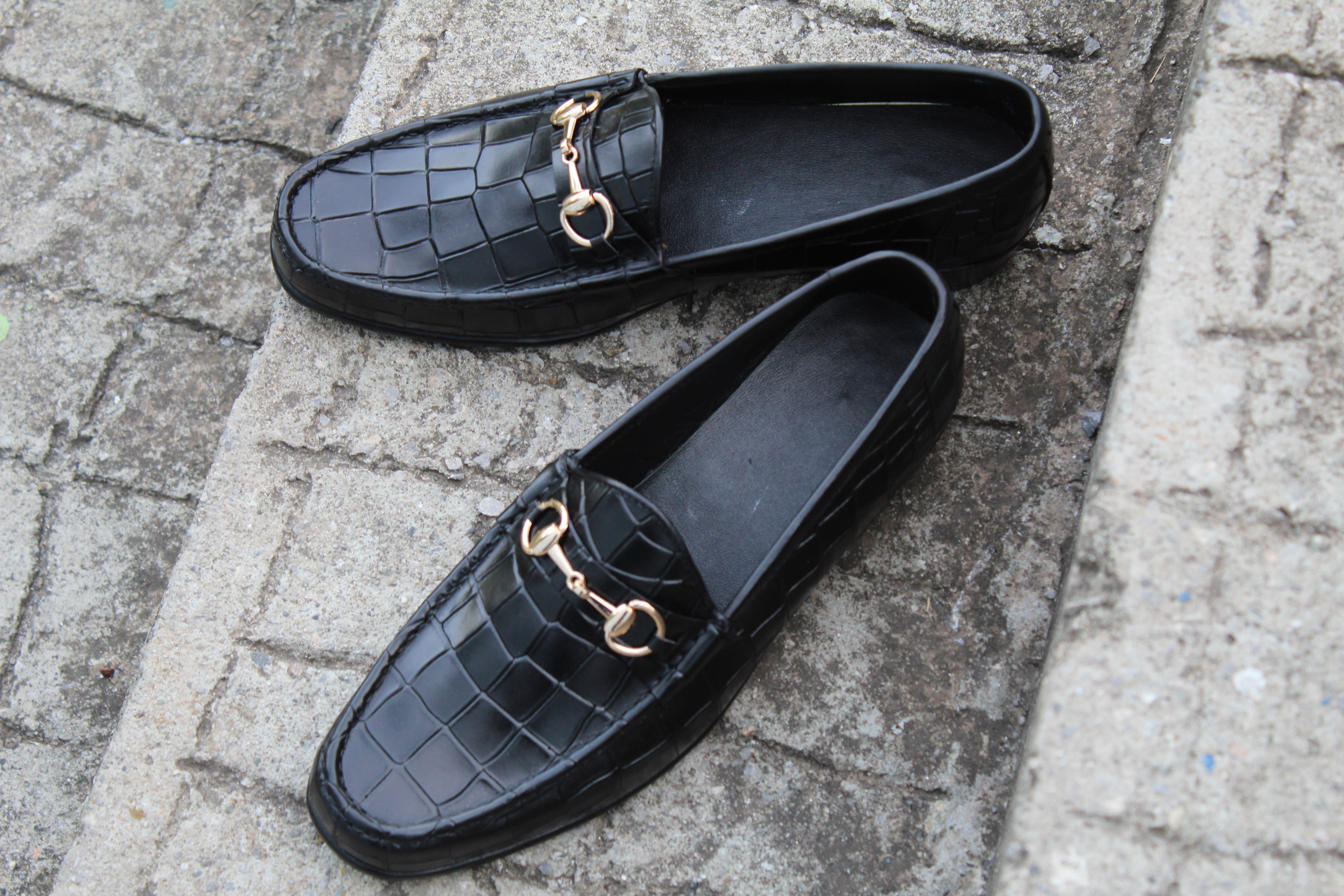 Handmade Stylish Black Crocodile Texture Leather Moccasin Loafer Shoes