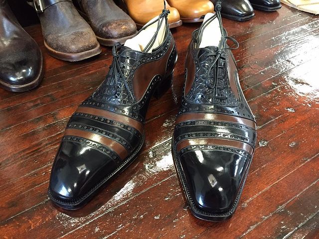 Handmade Black Crocodile and Brown French Calf Leather Lace up Shoes
