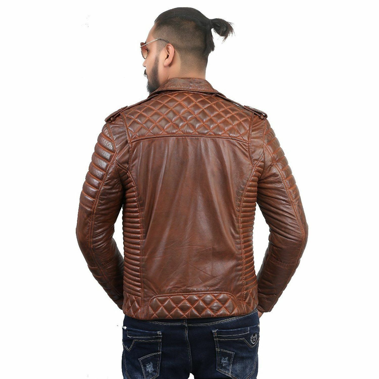 MENS BIKER VINTAGE MOTORCYCLE QUILTED DISTRESSED BROWN CAFE RACER LEATHER JACKETS