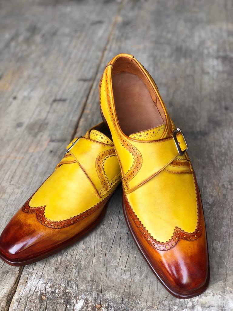 Handmade Yellow And Tan Brown Leather Monk Strap Men's Shoes