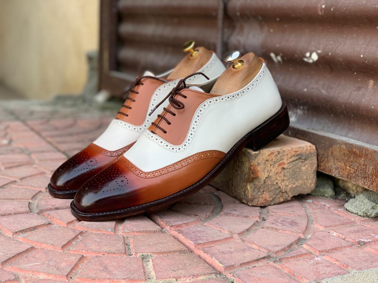 Bespoke White & Brown Square Toe Leather Shoes , Men's Handmade Dress Oxford Shoes