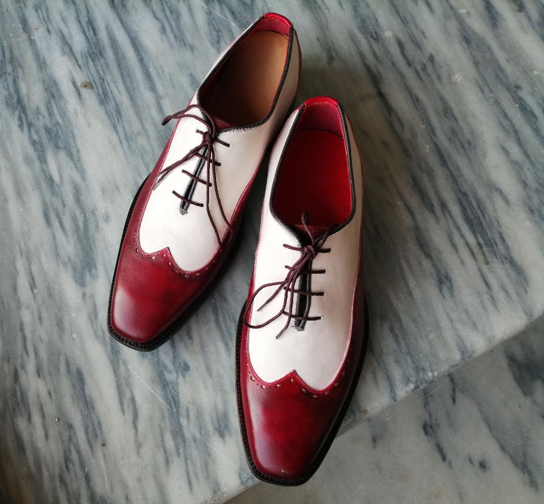 Handmade Men's Wing Tip Lace Up Shoes, Men's Burgundy White Leather Shoes