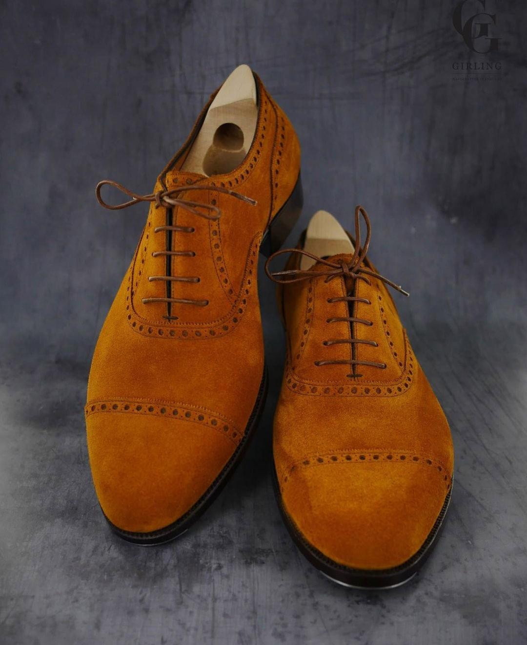 Handmade Tan Quarter Brogue Shoes, Lace Up Suede Men's Shoes