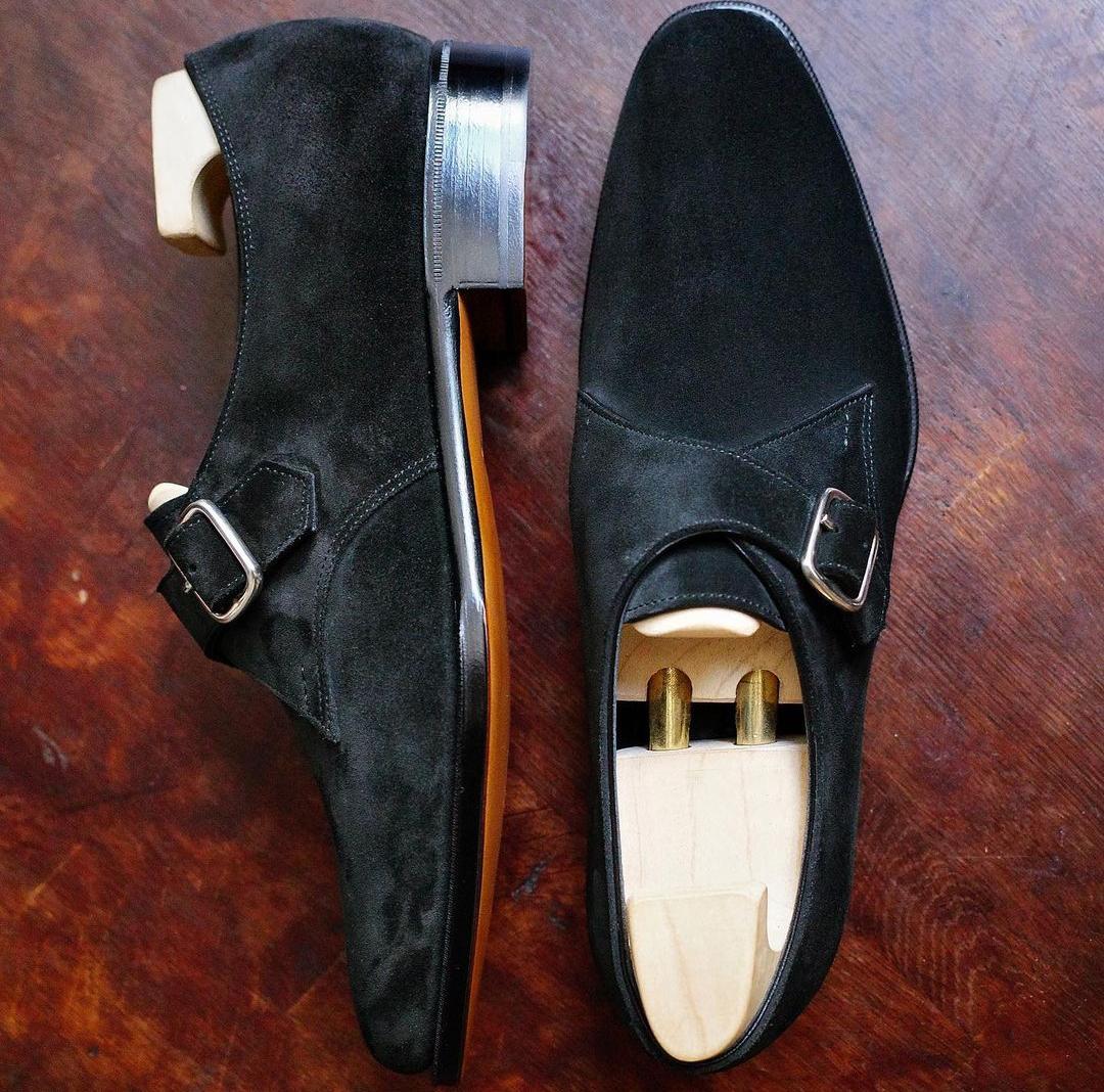Handmade Black Suede Single Monk Strap Plain Toe Men's Shoes