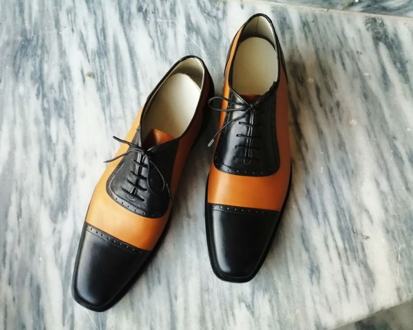 Handmade Men’s Cap Toe Lace Up Shoes Men’s Black Tan Leather Shoes