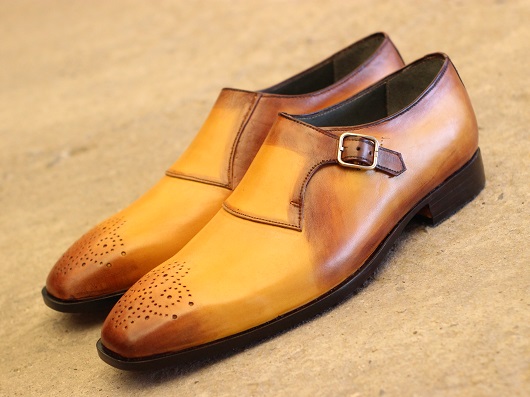 New Men's Handmade Dual Tone Yellow & Brown Leather Stylish Single Monk Strap Dress & Formal Wear Shoes