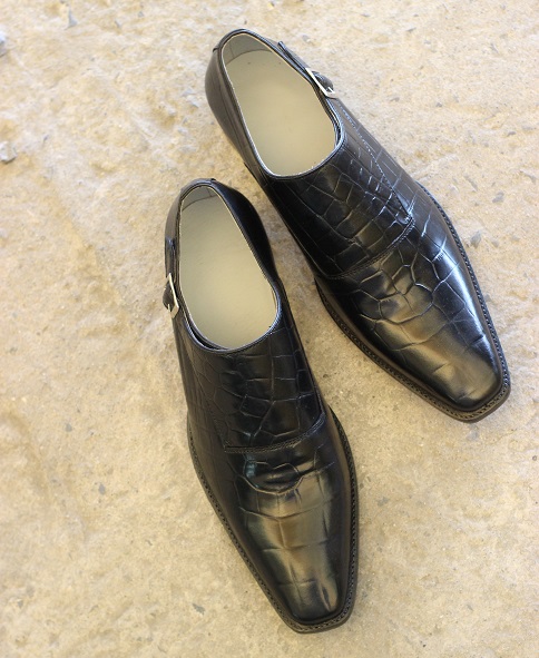 New Men's Handmade Black Crocodile Textured Leather Single Monk Style Dress & Casual Wear Shoes