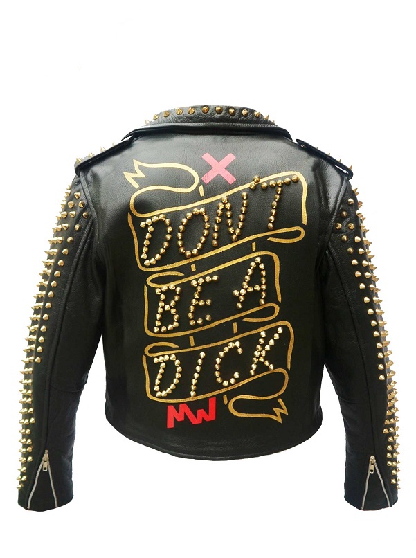 New Men Women's Custom Made Black Leather Full Metallic Studded Don't Be A Dick Printed Zipper Belted Stylish Leather Jackets