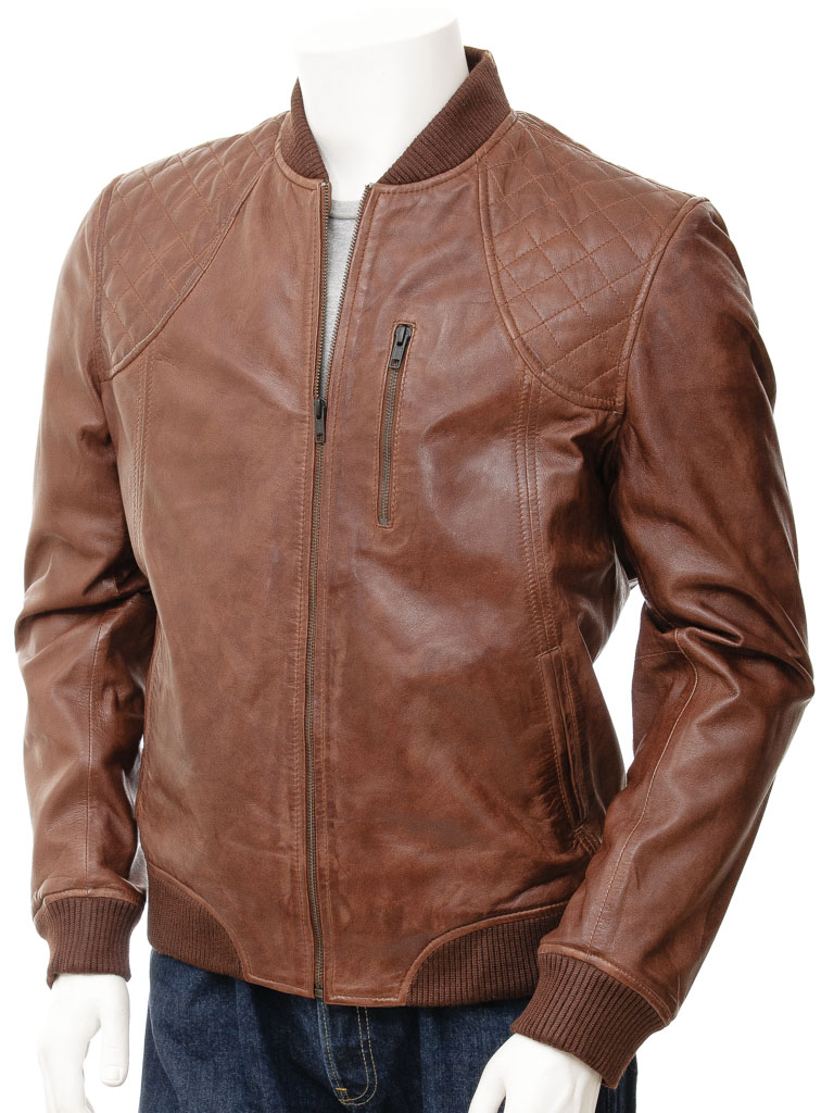 New Handmade Men's Chestnut Brown Bomber Hand Waxed Leather Jacket Diamond Quilted Jacket