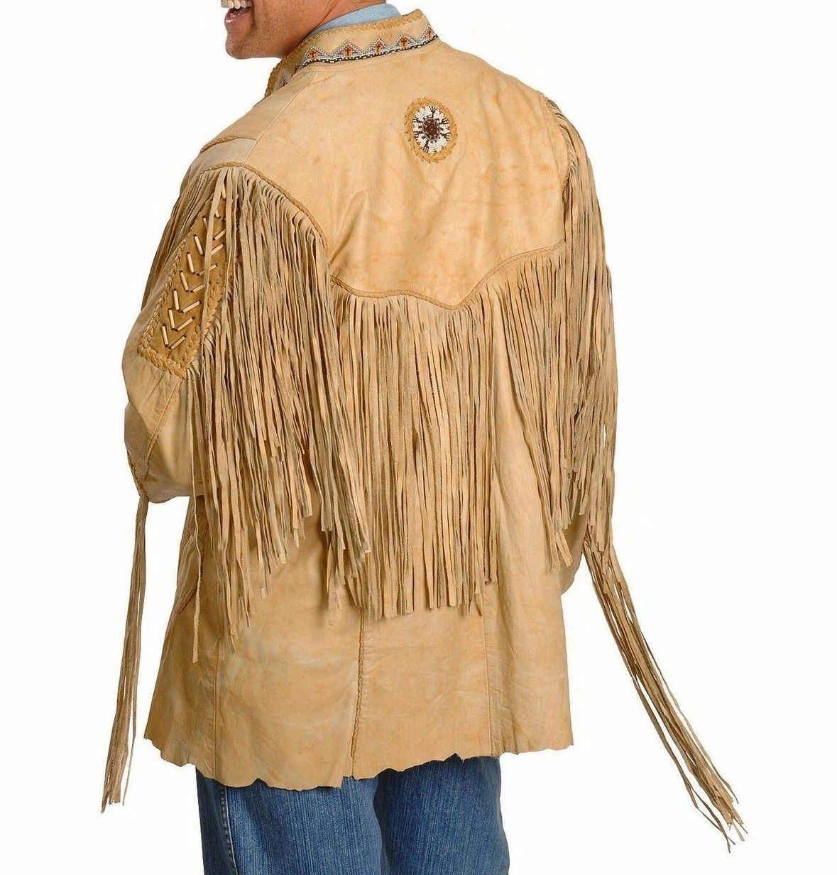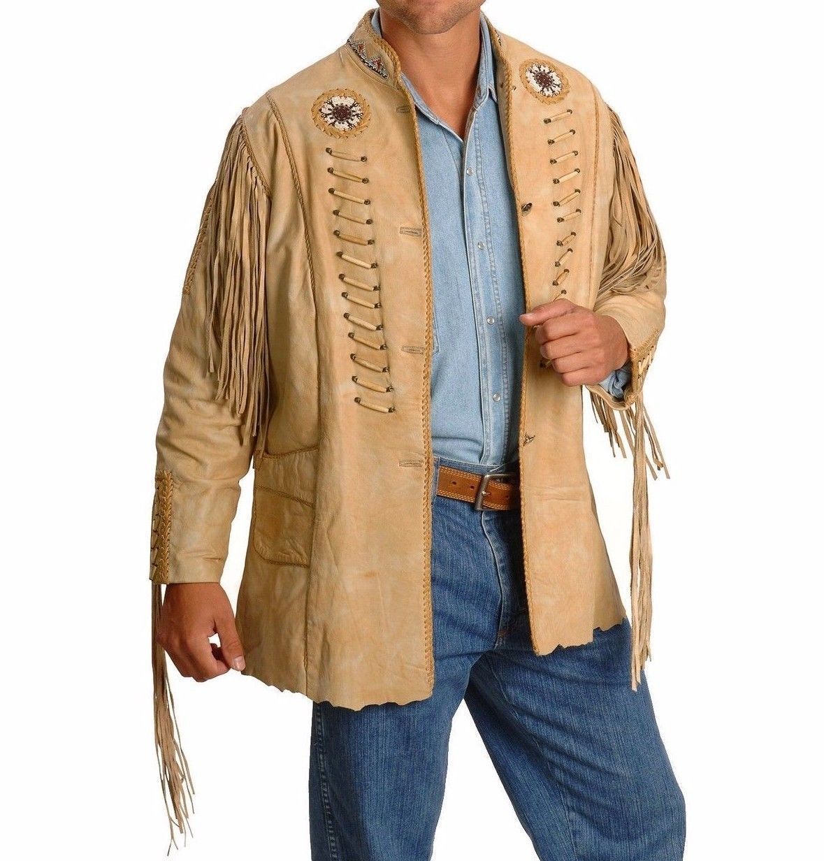 Men Beige Cowhide Jacket Cowboy Fringes & Beads Western Wear
