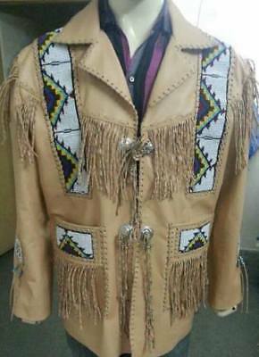 Men's Beige Cowhide Leather Vintage Cowboy Jacket Fringed and Beaded Coat