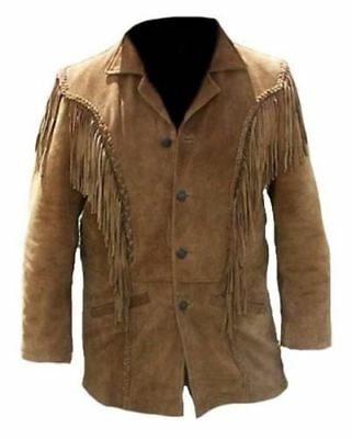 Western Men Wear Cow-boy Fringed Beige Suede Leather Coat