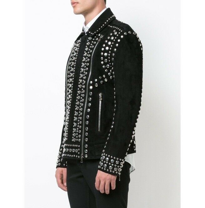 Handmade Men's Punk Rock Studded Suede Leather Jacket