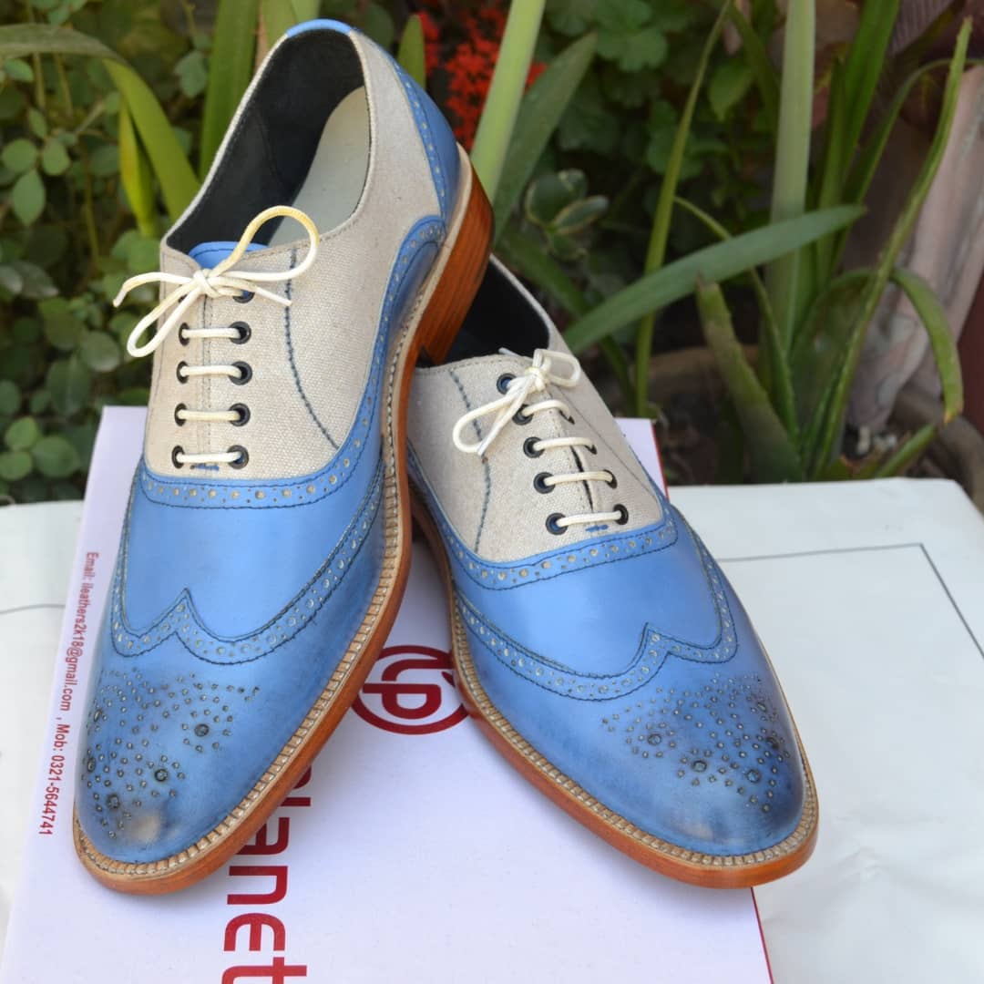Bespoke Handmade Classic men Blue and Suede Leather Wingtip Oxford Dress Shoes