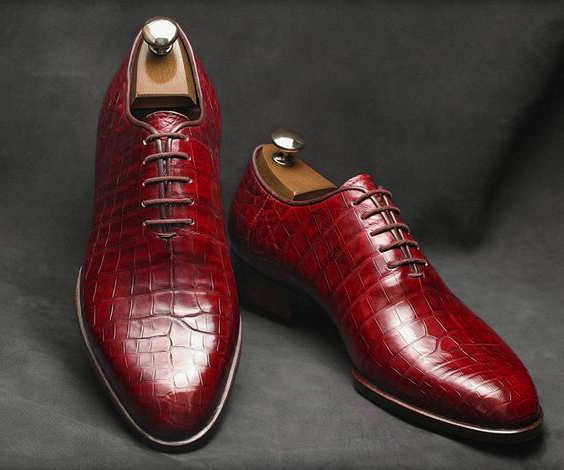 Handmade Leather Formal Crocodile Texture Derby Burgundy Shoes