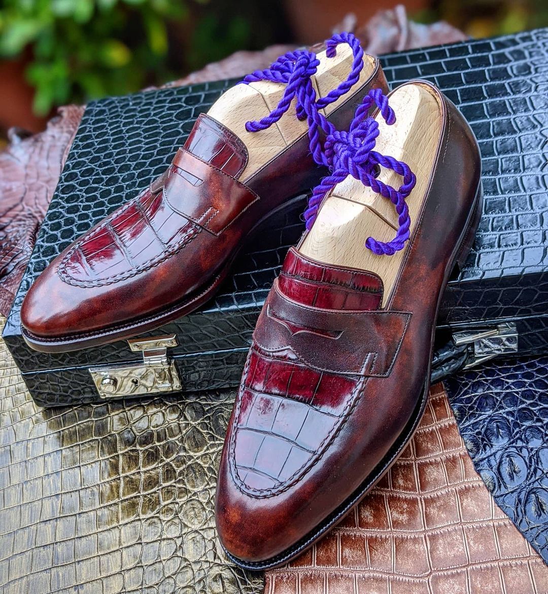 Bordeaux Crocodile Texture Leather Loafers Dress Shoes