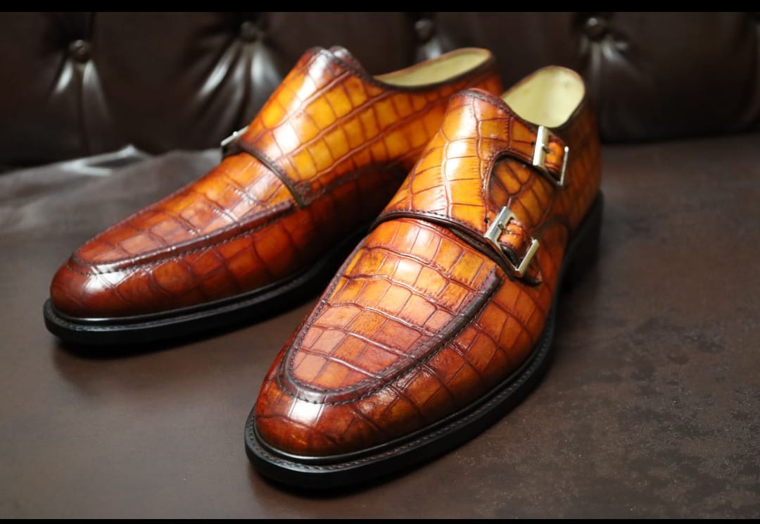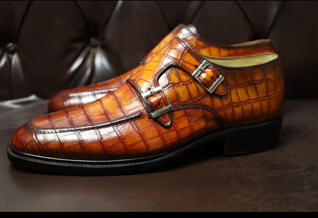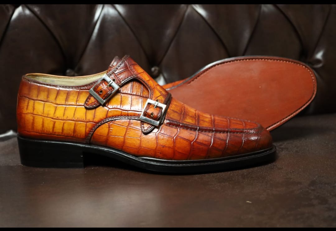 Handmade Brown Double Monk Crocodile Texture Leather Dress Shoes