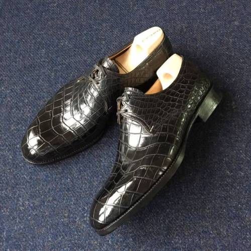 Two Eyelet Derby Black Crocodile Texture Leather Dress Shoes
