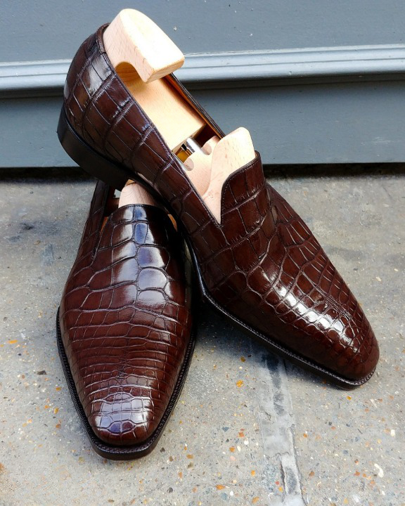 Handmade Dark Brown Crocodile Texture Leather Loafers Dress Shoes
