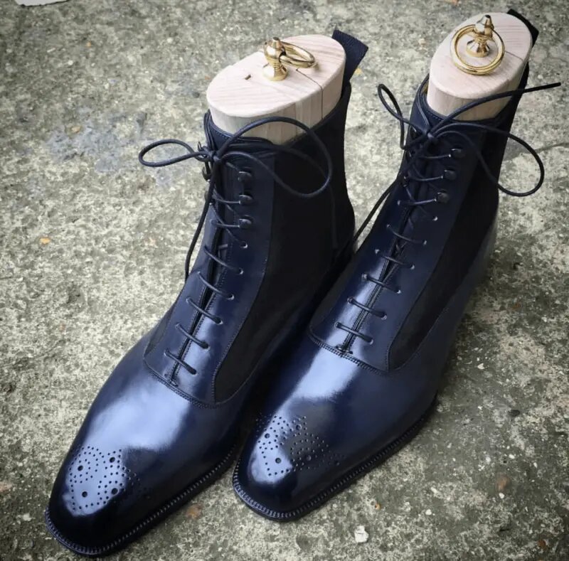 Blue Black Combination Leather / Suede Ankle High Lace up Balmoral Boots