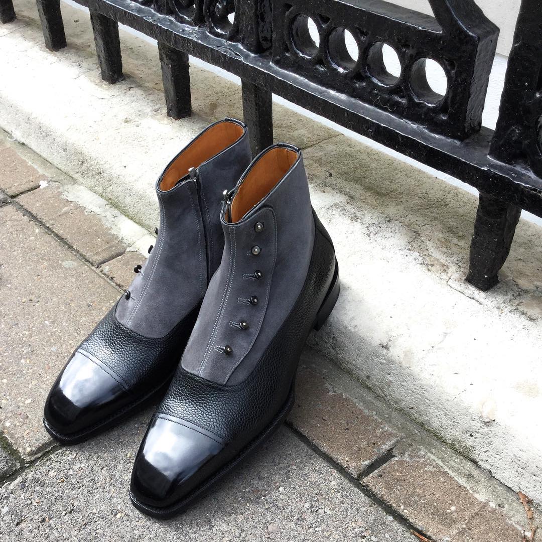 The Bespoke Men Button Black Calf Black Grain and Grey Suede Dress Balmoral Boot
