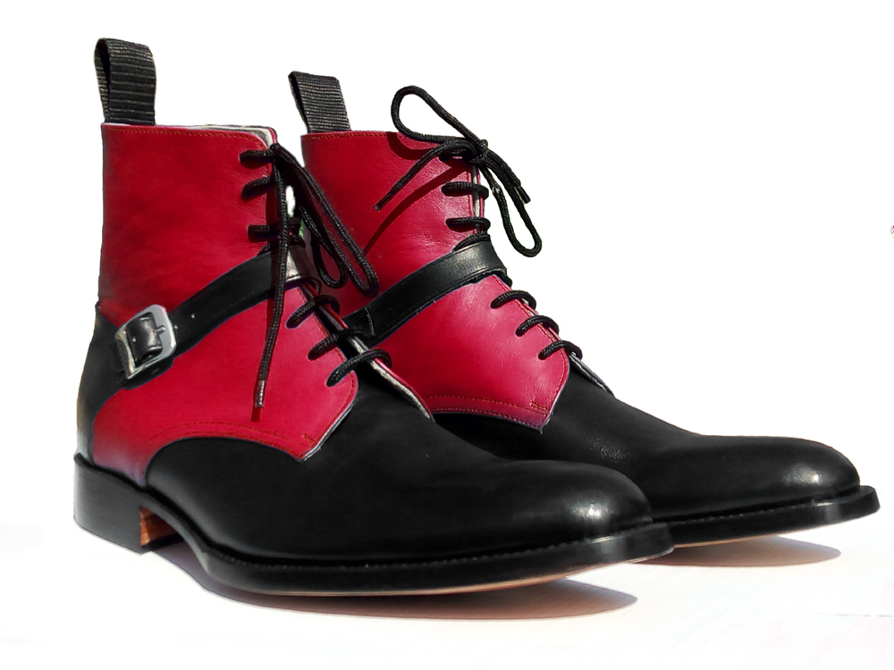 Red Black High Ankle Lace up Rounded Buckle Strap Genuine Leather Handmade Men Boots