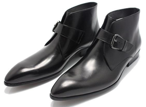 Men Black Handmade Genuine Leather Boots with Pointed Toe and Strap
