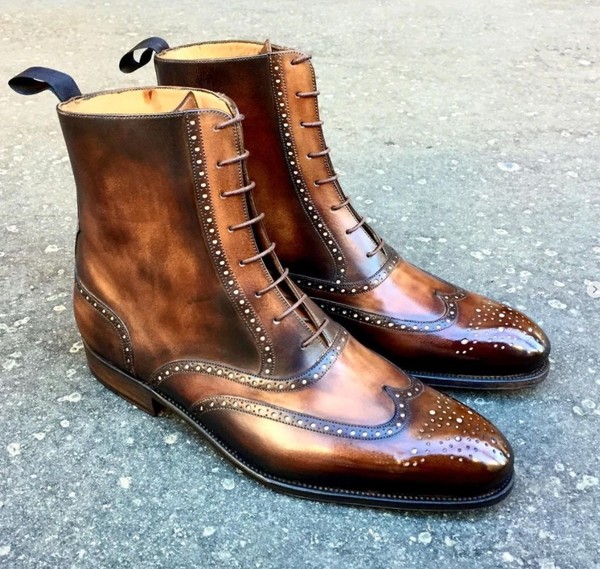 Men's Handmade Tan Patina Leather Oxford Brogue Wing Tip Lace Up Ankle Boots